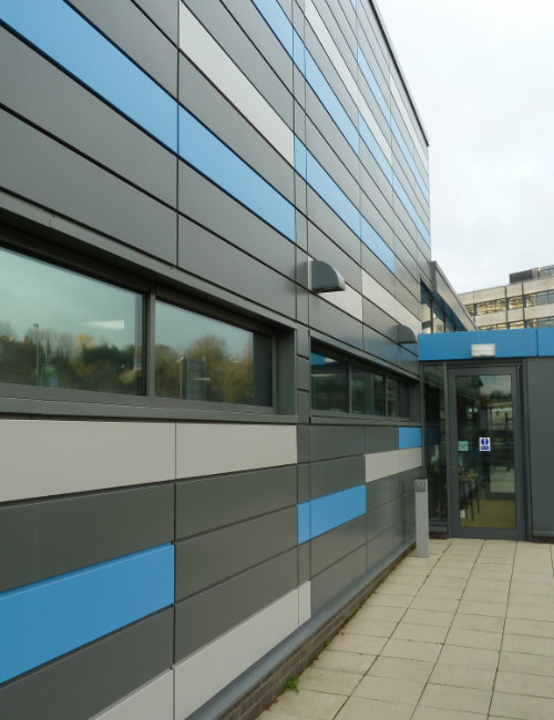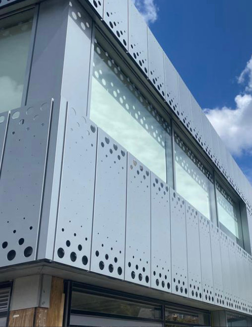 Our Slimwall™ flat panel system is available in aluminium, steel and Cor-ten and can be used either as a rainscreen or as a complete NON-COMBUSTIBLE insulated assembly.